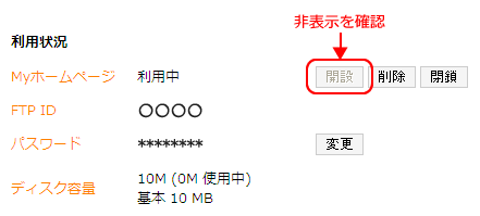 (4) Myホームページ開設状況の確認 「Myホームページ」設定画面が表示されますので、以下のように「開設」ボタンが非表示状態になっていることをご確認ください。