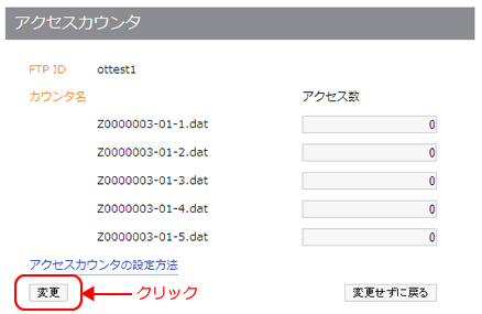 上記 (5) アクセスカウンタの作成 で「作成/変更」ボタンをクリックすると、お客さまのアクセス数記録ファイル名(カウンタ名)と現在のアクセス数が表示されます。(新規設置の場合は、アクセス数は 0 になります。)