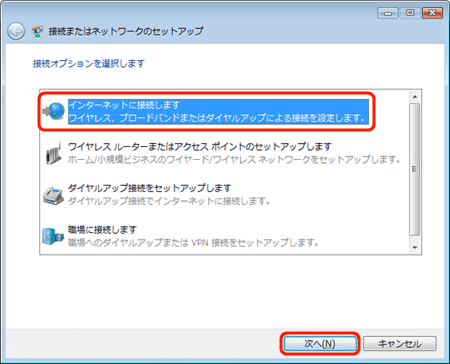 | 「インターネットに接続します」を選択して、「次へ」をクリックします。