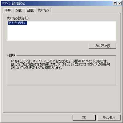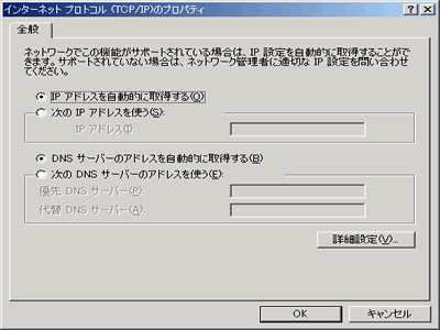 [詳細設定]ボタンをクリックし、TCP/IP 詳細設定画面が表示されますので、正しい設定が行われているかを確認します。