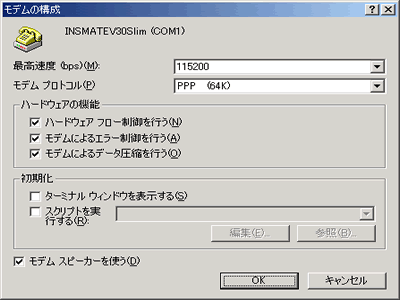 [構成]ボタンをクリックし、モデムの構成画面が表示されますので、正しい設定が行われているか確認し、[OK]ボタンをクリックします。