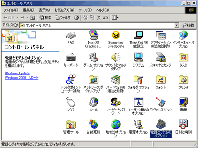 | [スタート] → [設定] → [コントロールパネル]を開き、「電話とモデムのオプション」アイコンをダブルクリックします。
