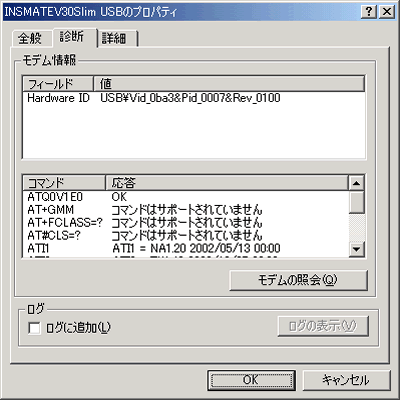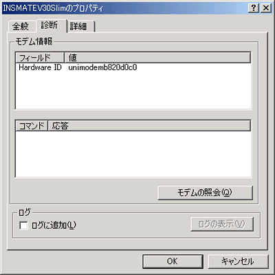 [モデムの照会]ボタンをクリックします。「モデムを使って通信しています。この処理には数分かかります。」のメッセージの後、[コマンド] [応答]に文字列が表示されればパソコンとモデム間の通信が正常に行える状態になっています。