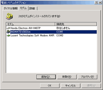 電話とモデムのオプション画面に戻りますので、[モデム]タブをクリックし、ご利用されるモデムが一覧に表示されることを確認します。