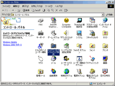 | [スタート] → [設定] → [コントロールパネル]を開き、「ネットワークとダイヤルアップ接続」アイコンをダブルクリックします。