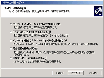 | 「インターネットにダイヤルアップ接続をする」にチェックを入れて、[次へ]ボタンをクリックします。