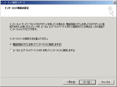 「電話とモデムを使ってインターネットに接続します」にチェックを入れ、[次へ]ボタンをクリックします。