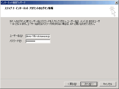 「ログオン情報」を下記のとおり入力し、[次へ]ボタンをクリックします。