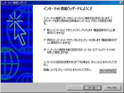 | 「インターネット接続を手動で設定するか、ローカルエリアネットワーク(LAN)を使って接続します」にチェックを入れて、[次へ]ボタンをクリックします。