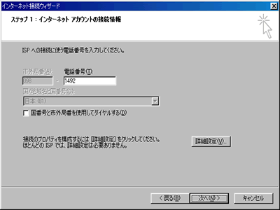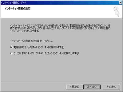 | 「電話回線とモデムを使ってインターネットに接続します」にチェックを入れて、[次へ]ボタンをクリックします。