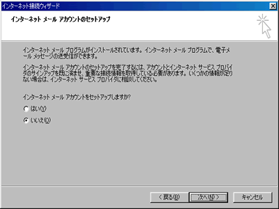 「インターネットメールアカウントをセットアップしますか?」に任意でチェックを入れ、[次へ]ボタンをクリックします。(※ここでは「いいえ」としています。「はい」にすると、Outlook Expressの設定に移ります)