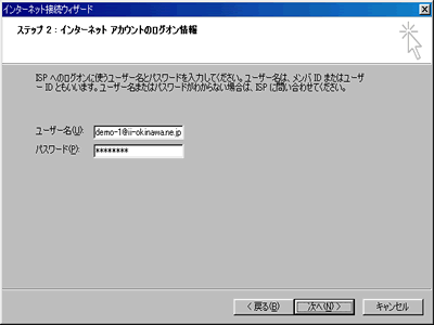 「ログオン情報」を下記のとおり入力し、[次へ]ボタンをクリックします。