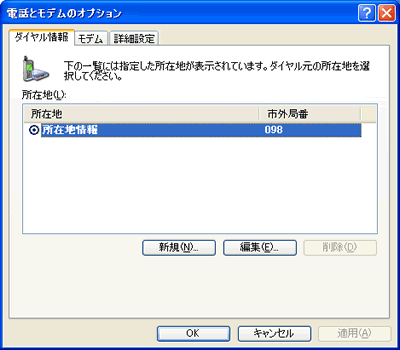 | 「電話とモデムのオプション」画面が表示されるので、「ダイヤル情報」タブより「所在地情報」が選択された状態で、[編集]ボタンををクリックします。