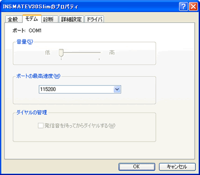 [モデム]タブをクリックし、 正しい設定が行われているか確認します。