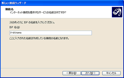 「ISP 名」に ii-okinawa を入力(※任意の名前で構いません)し、 [次へ]ボタンをクリックします。