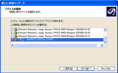 「デバイスの選択」画面より、ご利用のモデムにチェックを入れ、[次へ]ボタンをクリックします。