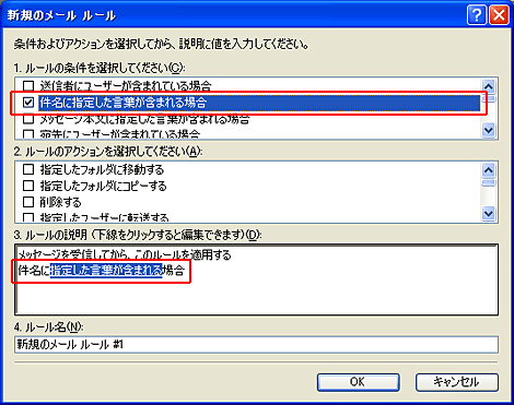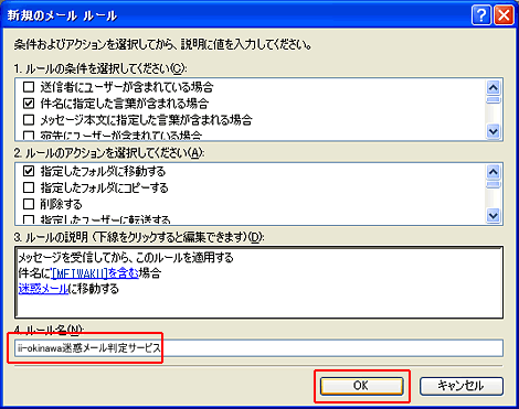 本設定例は迷惑メール判定サービスを「有効」と設定した場合の設定例です。 1.Outlook Expressの起動OutlookExpress(Version6.0) を起動します。 2.メッセージルールメニューバーの「ツール」より「メッセージルール」を選択し、「メール」をクリックします。 3.ルールの条件1.ルールの条件選択より、「件名に指定した言葉が含まれる場合」をチェックし、3.ルールの説明より「指定した言葉が含まれる」(ハイパーリンク)をクリックします。 4.単語の入力入力欄に 半角大文字で [MEIWAKU] と正しく入力し、「追加」ボタンをクリックします。 5.単語の入力下の単語リストに [MEIWAKU] が追加されたことを確認し 「OK」ボタンをクリックします。 6.ルールのアクション2.ルールのアクション選択より、「指定したフォルダに移動する」をチェックし、3.ルールの説明より「指定したフォルダ」(ハイパーリンク)をクリックします。 7.移動先のフォルダ「新規フォルダ」ボタンをクリックして、任意のフォルダを作ります。 8.移動先フォルダの作成任意のフォルダ名を入力し、「OK」ボタンをクリックします。 9.移動先フォルダの選択作成したフォルダを選択して、「OK」ボタンをクリックします。 10.ルール名4.ルール名に任意の名前を入力し、「OK」ボタンをクリックします。 11.設定完了メールルールに設定したルール名がチェックされていることを確認し、「OK」ボタンをクリックします。 |