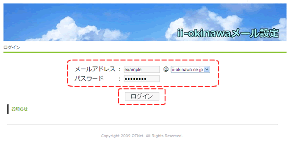 「迷惑メール判定サービス」は、メール設定画面にて迷惑メール判定サービスの設定を有効にしてご利用ください。 (1) メール設定画面以下の【メール設定画面】ボタンをクリックし、メール設定画面を開きます。 (2) ログインメール設定画面(ii-okinawaメール設定)のログイン画面へ、迷惑メール判定サービスを設定したいメールアドレスとメールのパスワードを入力し、【ログイン】ボタンをクリックします。