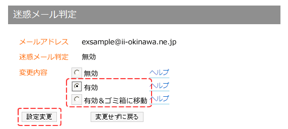 (4) 迷惑メール判定画面迷惑メール判定より、迷惑メール判定サービスの設定を変更することができます。「有効」または「有効&ゴミ箱に移動」の何れかご希望の設定を選択し、【設定変更】ボタンをクリックします。