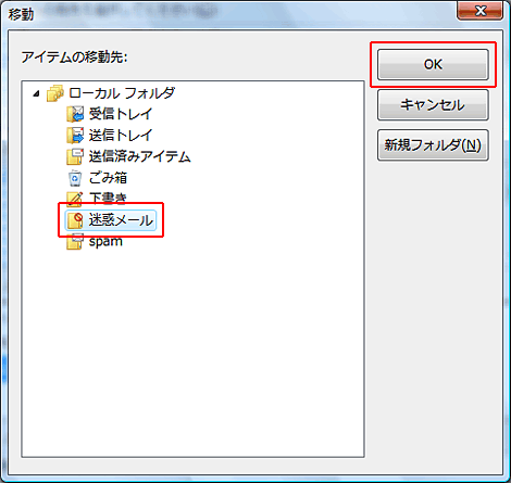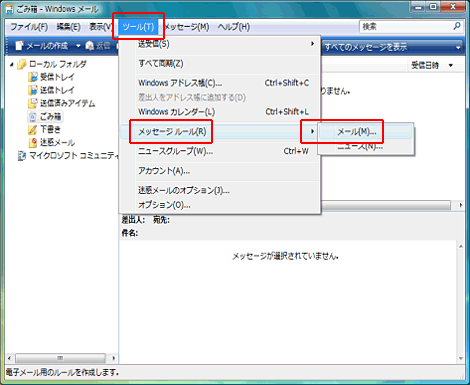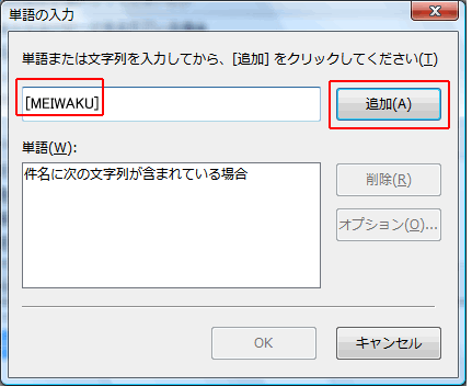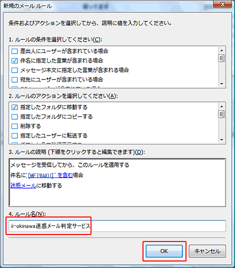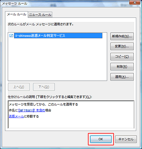 本設定例は迷惑メール判定サービスを「有効」と設定した場合の設定例です。 1.Windowsメールの起動Windowsメール(Version6.0) を起動します。 2.メッセージルールメニューバーの「ツール」より「メッセージルール」を選択し、「メール」をクリックします。 3.ルールの条件1.ルールの条件選択より、「件名に指定した言葉が含まれる場合」をチェックし、3.ルールの説明より「指定した言葉が含まれる」(ハイパーリンク)をクリックします。 4.単語の入力入力欄に 半角大文字で [MEIWAKU] と正しく入力し、「追加」ボタンをクリックします。 5.単語の入力下の単語リストに [MEIWAKU] が追加されたことを確認し 「OK」ボタンをクリックします。 6. ルールのアクション2.ルールのアクション選択より、「指定したフォルダに移動する」をチェックし、3.ルールの説明より「指定したフォルダ」(ハイパーリンク)をクリックします。 7.移動先のフォルダ(1)「新規フォルダ」ボタンをクリックして、任意のフォルダを作ります。 8.移動先のフォルダ(2)既に「迷惑メール」等といったフォルダがある場合は、フォルダを選択して「OK」ボタンをクリックします。 9.ルール名4.ルール名に任意の名前を入力し、「OK」ボタンをクリックします。 10.設定完了メールルールに設定したルール名がチェックされていることを確認し、「OK」ボタンをクリックします。 |