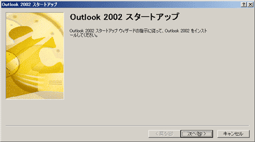 | 初めてOutlook 2002を起動した場合には、「Outlook 2002スタートアップ」の画面が表示されます。「次へ(N) >」ボタンをクリックします。