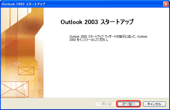 *「Outlook 2003 スタートアップ」画面が表示されない場合は、メニューバーより「ツール」→「電子メールアカウント」を選択します。「新しい電子メールアカウントの追加」を選択し、「次へ」をクリックしてください。その後、手順 [3] へ進みます。