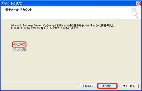 「電子メールアカウント」画面が表示されます。【はい】を選択し、【次へ】をクリックします。
