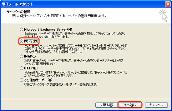 「サーバーの種類」画面が表示されます。【POP3】を選択し、【次へ】をクリックします。