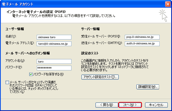 | 「インターネット電子メールの設定」画面に戻ったら、【次へ】をクリックします。
