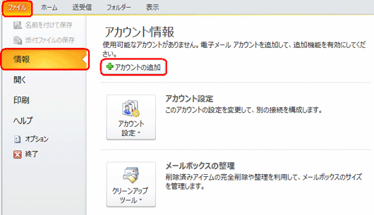 Outlook 2010 で新しくメールアカウントを設定する場合の説明です。