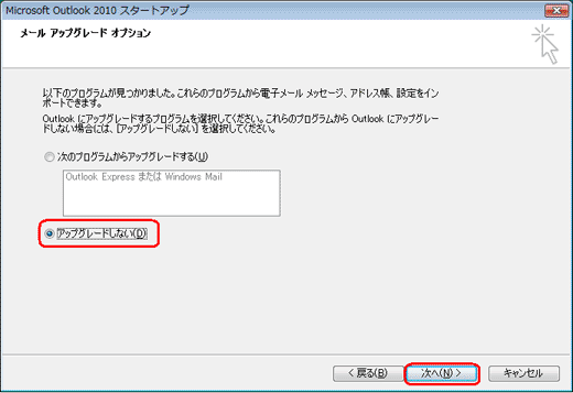 その場合は、【アップグレードしない】を選択し、【次へ】をクリックします。