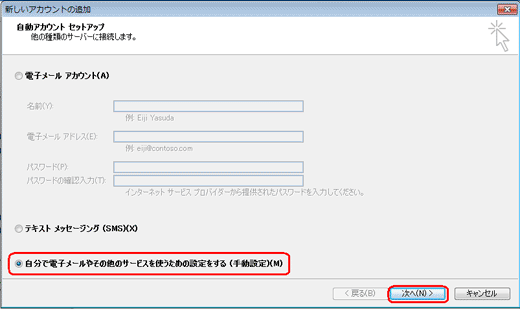 「自動アカウント セットアップ」画面が表示されます。画面左下の【自分で電子メールやその他のサービスを使うための設定をする(手動設定)】にチェックを入れ、【次へ】をクリックします。