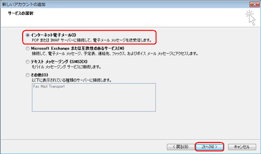 【インターネット電子メール】を選択し、【次へ】をクリックします。 |