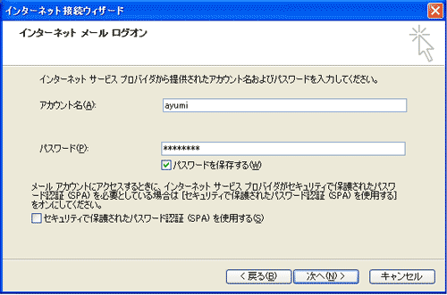 表示された【インターネット接続ウィザード】の【インターネット メール ログオン】の 画面にて、以下のように設定します。