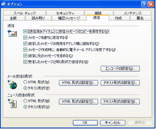 | 表示された【オプション】の画面にて、【送信】のタブをクリックし、以下のように設定します。