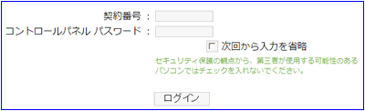 (2) コントロールパネルへログイン 「契約番号」と「コントロールパネルパスワード」を入力して、ii-okinawaコントロールパネルへログインします。