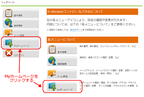 (3) 「Myホームページ」ボタンをクリック コントロールパネルへログインすると以下のトップページが表示されますので左側のメニューから「Myホームページ」ボタンをクリックし、「Myホームページ」設定画面を開いてください。