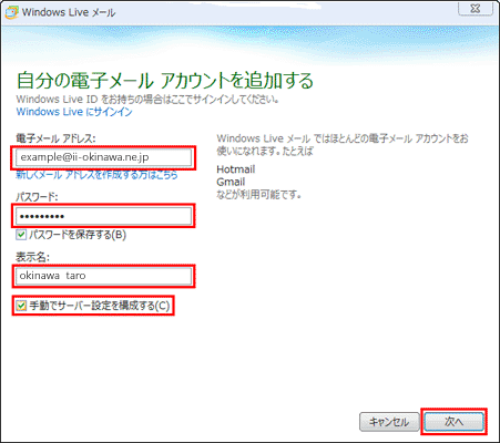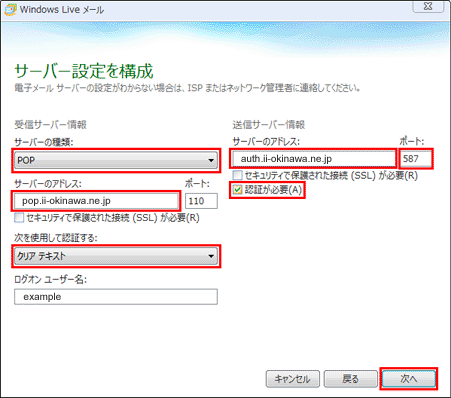 「Windows Live メール」画面の各項目を以下のように設定します。