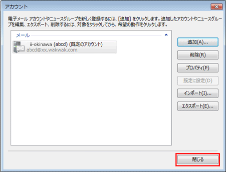 「アカウント」画面で、【閉じる】をクリックし、設定完了です。