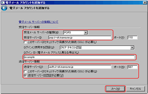 電子メールアカウントを選択し、【次へ】ボタンをクリックします。