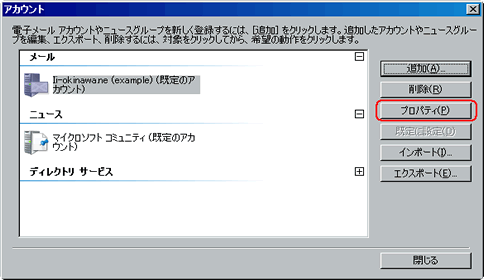 追加されたアカウントを選択し、【プロパティ】ボタンをクリックします。