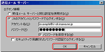 送信メールサーバー画面より、以下のとおり入力し、【OK】ボタンをクリックします。