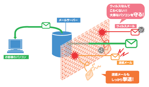 - お客様が送受信するメールを弊社サーバ側にてウィルスチェックし、ただちに駆除。電子メールを媒体として侵入するウィルスからお客様のパソコンを守ります。