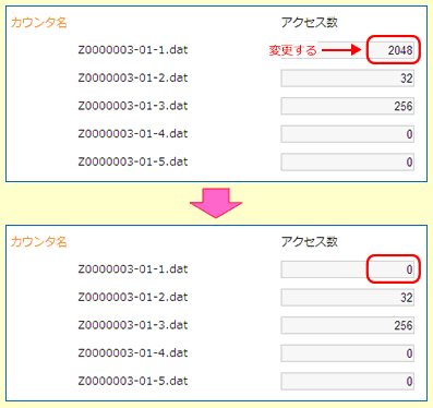 上記 (5) アクセスカウンタの作成 で「作成/変更」ボタンをクリックすると、お客さまのアクセス数記録ファイル名(カウンタ名)と現在のアクセス数が表示されます。(新規設置の場合は、アクセス数は 0 になります。)