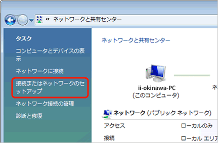 | 「ネットワークと共有センター」画面より、左側タスクから 「接続またはネットワークのセットアップ」をクリックします。