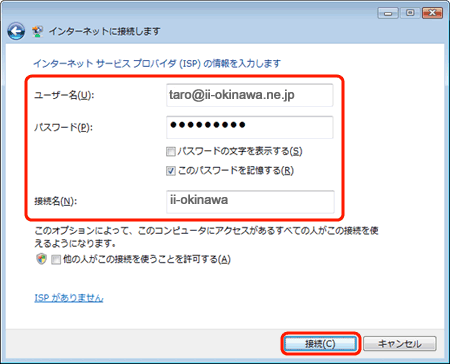 ii-okinawaの登録証に記載されている 接続IDパスワード を入力します。 |