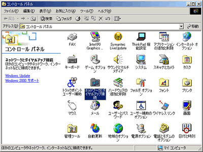 | [スタート] → [設定] → [コントロールパネル]を開き、「ネットワークとダイヤルアップ接続」アイコンをダブルクリックします。