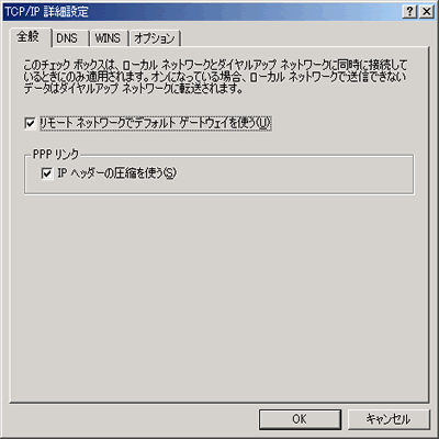 [詳細設定]ボタンをクリックし、TCP/IP 詳細設定画面が表示されますので、正しい設定が行われているかを確認します。