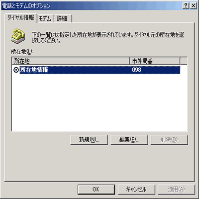 | 電話とモデムのオプション画面が起動しますので、「所在地情報」を選択し、[編集]ボタンをクリックします。