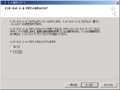 「インターネットメールアカウントをセットアップしますか?」に任意でチェックを入れ、[次へ]ボタンをクリックします。(※ここでは「いいえ」としています。「はい」にすると、Outlook Expressの設定に移ります)